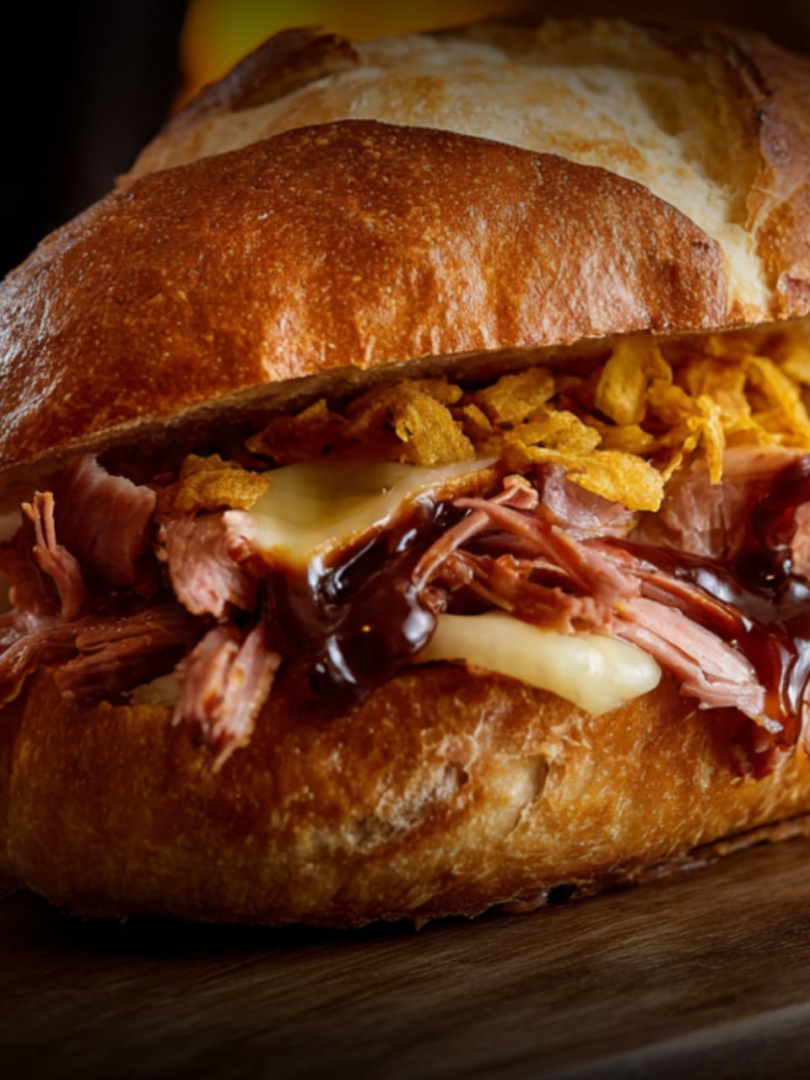 Pernil desfiado e temperado, marinado no molho de cerveja tipo Stout, aroma defumado, queijo provolone, cebola crispy e mostarda amarela a bse de cerveja pilsen no pão.